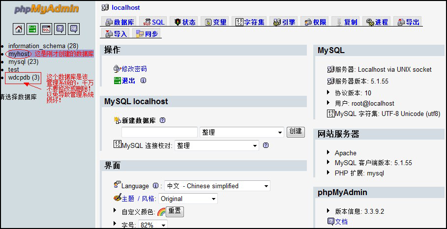 在phpmyadmin管理中點擊您剛才創建的數據庫,如myhost,進入到myhost數據庫的管理界面。 注意:wdcpdb這個數據庫不要修改和刪除,誤操作將會導致wdcp管理系統損壞!!如圖:
