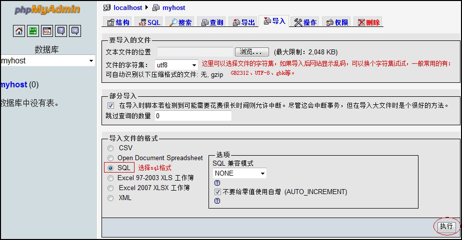 點擊最上邊的“導入”,選擇您電腦上的sql文件以及對應的字符集,點擊執行即可。如圖: