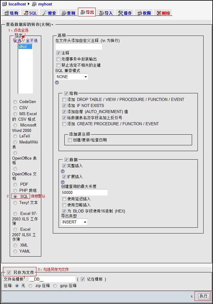 數據庫導出: 點擊最上方的“導出”,在左側點擊“全選”,選擇所有的表,選擇格式“SQL”,下方選擇另存為,點擊“執行”,如圖: