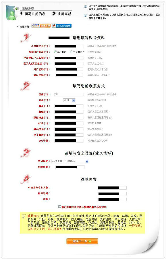 禾城數碼會員注冊流程圖文解析一、支付寶快捷登錄 在網站的最上方『快速登錄』處選擇『支付寶快捷登錄』 輸入支付寶帳號密碼: 支付寶快捷登錄成功后直接顯示管理中心,頁面如下: 登錄成功后即可進行虛擬主機" style="color:#ff0000;text-decoration:underline;">西部數碼虛擬主機或西部數碼域名購買及其他交易。 二、QQ帳號登錄 在網站的最上方『快速登錄』處選擇『用QQ帳號登錄』 彈出QQ登錄窗口選擇帳號進行登錄: 快速登錄成功后完善聯系方式: QQ快捷登錄成功后顯示頁面如下: 登錄成功后即可進行西部數碼虛擬主機或西部數碼域名購買及其他交易,需查看已購買產品請點擊『管理中心』 三、在線注冊后帳號登錄 單擊注冊如圖: 完善相關資料后繼續下一步: 填寫完畢后『繼續下一步』顯示注冊成功頁面,并同時給您剛才填寫的郵箱發去郵件,當您忘記密碼的時候可以查看該郵件。點擊登錄管理中心即可進行西部數碼產品購買。 以上就是三種登錄西部數碼代理_禾城數碼的方法。