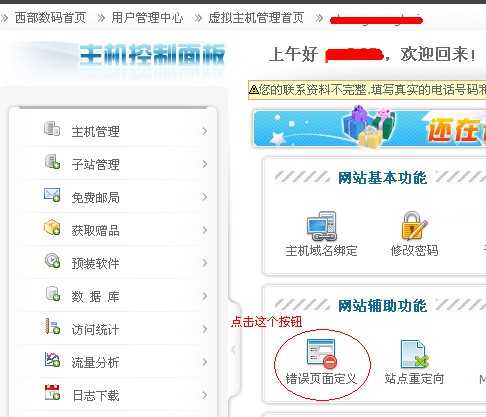 虛擬主機(jī)如何設(shè)置404自定義錯(cuò)誤頁面設(shè)置一個(gè)好的自定義錯(cuò)誤頁面,可以增加網(wǎng)站的收錄,挽留住一些可能因打不開的頁面而放棄的客戶,我司虛擬主機(jī)特別提供了自定義錯(cuò)誤頁面設(shè)置,包括404錯(cuò)誤在內(nèi)的所有自定義錯(cuò)誤都可以設(shè)置。 LINUX系統(tǒng)的設(shè)置方法: 第一步:在.htaccess文件中加入如下語句: WIN平臺(tái)虛擬主機(jī)的設(shè)置方法: 首先,打開我司網(wǎng)站,輸入用戶名和密碼登陸到管理中心,點(diǎn)擊左側(cè)的“業(yè)務(wù)管理”—“虛擬主機(jī)管理” 然后在右側(cè)選擇您的虛擬主機(jī),點(diǎn)“管理” 在虛擬主機(jī)管理面板,點(diǎn)擊“錯(cuò)誤頁面定義”,進(jìn)入自定義錯(cuò)誤設(shè)置。 在“錯(cuò)誤頁面定義”中點(diǎn)擊“設(shè)置自定義錯(cuò)誤”,系統(tǒng)會(huì)在您的wwwroot目錄下生成一個(gè)HttpErrors目錄,并將所有的錯(cuò)誤頁面復(fù)制到該目錄下,您只需下載相應(yīng)的頁面修改后再上傳即可。 功能提示