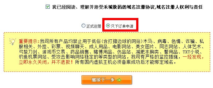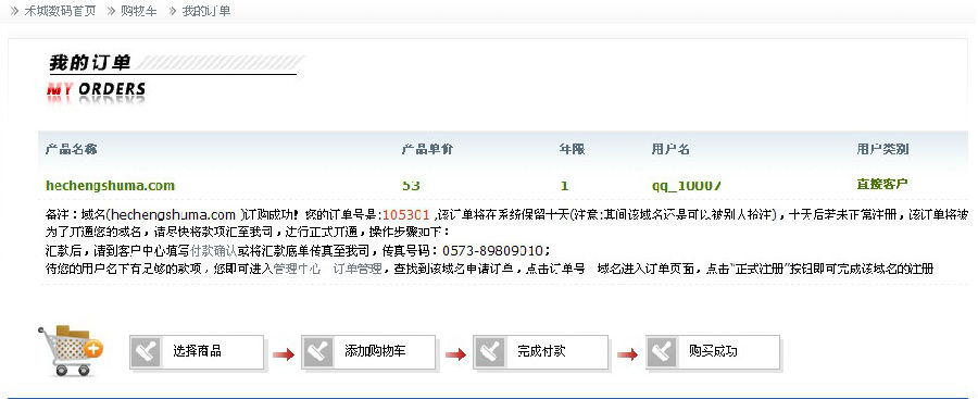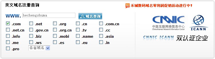 [原創(chuàng)]西部數(shù)碼域名購買流程(圖文)首先請在本平臺注冊一個帳號,具體操作步驟見禾城數(shù)碼會員注冊流程圖文解析。本文以注冊英文域名為實例。 一、鼠標移至【域名注冊】單擊【英文域名】 查詢要你要注冊的域名有沒有被注冊,需要什么樣的后綴就選擇什么樣的后綴,如果只需要注冊一種后綴就不需要多選了,這樣會方便下面的操作。 查詢顯示域名可以注冊,點擊立即注冊。 注冊域名時填寫的資料必須真實準確,填寫完畢后選擇只下訂單申請,由我們再復(fù)核一遍后再下單可以盡量避免資料填寫不準確。 此處保持默認即可,不用修改! 中文資料填寫完畢后英文資料會自動填寫,實際只需填寫郵編。然后選擇繼續(xù)下一步。 提交下一步后會出現(xiàn)該頁面: 然后聯(lián)系客服就可以幫您把域名注冊好。 禾城數(shù)碼是西部數(shù)碼代理,請大家放心注冊。
