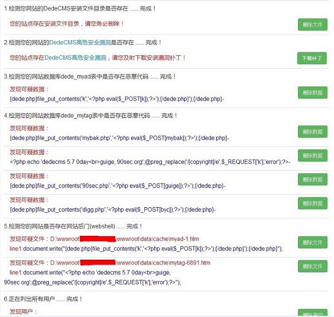DedeCMS頑固木馬后門專殺工具(適用織夢程序被掛碼、入侵的檢查和清理)下載DedeCMS頑固木馬后門專殺工具,解壓上傳到wwwroot根目錄,然后訪問根據提示執行掃描。 需注意:1.跟目錄下必須有data目錄和/data/common.inc.php文件,如不存在會報“請將該文件放到您站點的根目錄,和index.php同一級目錄”錯誤。 2.文件太多執行時間較長,可能超時,可以修改ini_set("memory_limit", "100m")值為ini_set("memory_limit", "500m"),最大不能超過1000M。 以下是檢查示例: 經核實:第1項可刪除;第2項補丁一定要打,才能保證不會被再次入侵;3-5項發現的可疑數據或文件都確是被惡意增加數據和木馬文件,可直接清理;第6項列出管理員名,如確定不是自己使用的用戶可刪除,必須保留自己使用的管理員名。