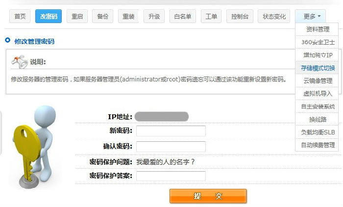 如果您不小心忘記了云主機(jī)的管理密碼,可以在這里在線修改主機(jī)管理員密碼。操作時(shí)需要回答一個(gè)密保問題,以確保安全性。