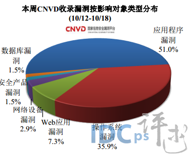 如圖9所示,在本周收入漏洞按影響對象類型分布中,應用程序漏洞、操作系統漏洞的占比突出,依次達到51.0%、35.9%,位居前二。其中,應用程序漏洞占比較上周減少了21.2%,而操作系統漏洞則上升了25.1%。接下來,Web應用漏洞占7.3%,網絡設備漏洞占2.9%,安全產品漏洞與數據庫漏洞均占1.5%。