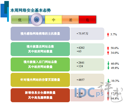 另外,境內被植入后門網站總數環比上周減少60.0%,降至2841個,其中政府網站數量跌至124個;針對境內網站的仿冒頁面數量有4857個,相比上周下降10.3%。