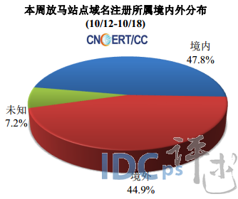 根據圖4,本周放馬站點域名注冊所屬境內外分布情況如下:境內占比47.8%,排名居首;境外占比44.9%,排名居次;最后是未知屬地占比,僅為7.2%。