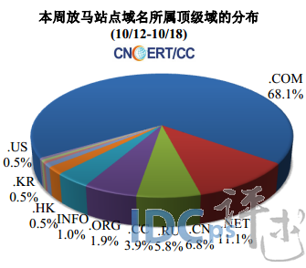 如圖5所示,本周207個放馬站點所屬頂級域排名分布情況,與上周對比,有所變化。其中,上周與.CN并列第3名的.RU,本周跌至第4名,但其占比并未縮小,反而小升至5.8%。需要注意的是,受.RU排名下降影響,位居其后的.CC、.ORG、.INFO等域名排名紛紛下滑。另外,比重最大的依舊是.COM,占比為68.1%,環比上周有所下降。