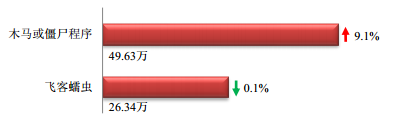 通過圖2可知,本周境內感染網絡病毒的主機數量約75.97萬個,與上周對比,上漲了5.7%。其中,境內被木馬或僵尸程序控制的主機約49.63萬個,較上周上升9.1%;而感染飛客(conficker)蠕蟲的主機約26.34萬個,環比上周下降了0.1%。