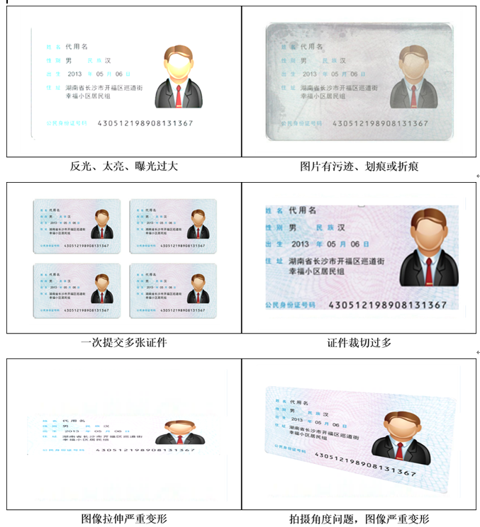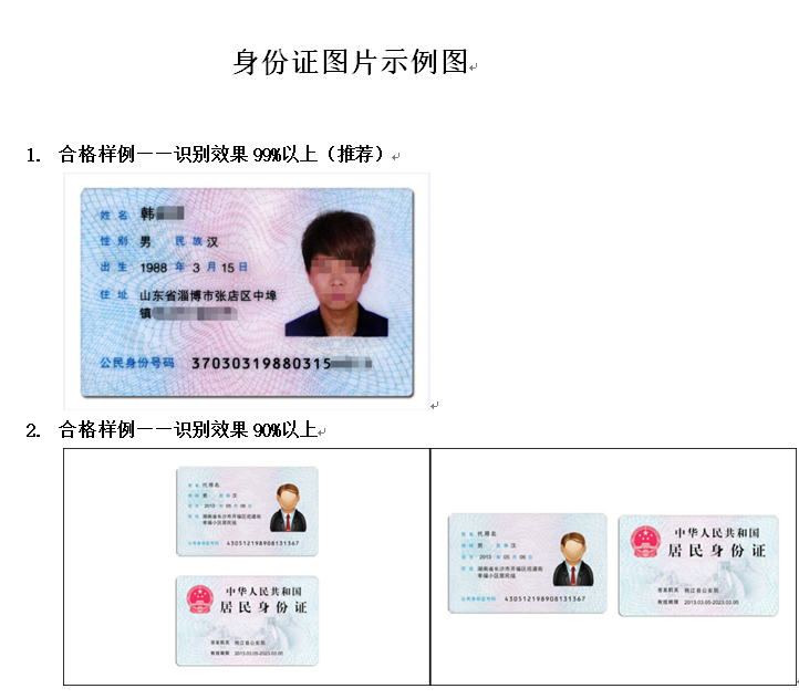 2. 建議身份證圖片保證完整,避免裁剪邊角框、有污跡、劃痕或折痕。