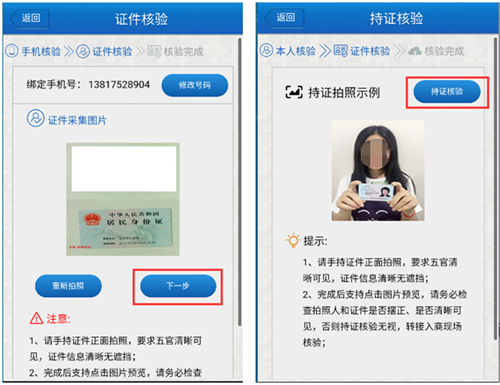 5、證件核驗完成后,點擊“下一步”進入持證核驗。點擊“持證核驗”,手持身份證拍攝正面照。
