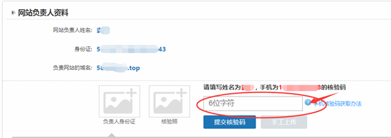8、在備案平臺-上傳網站負責人資料處,注意核對網站負責人姓名與手機號,與APP核驗時信息是否一致,確認無誤后錄入6位字符的核驗碼,并提交;
